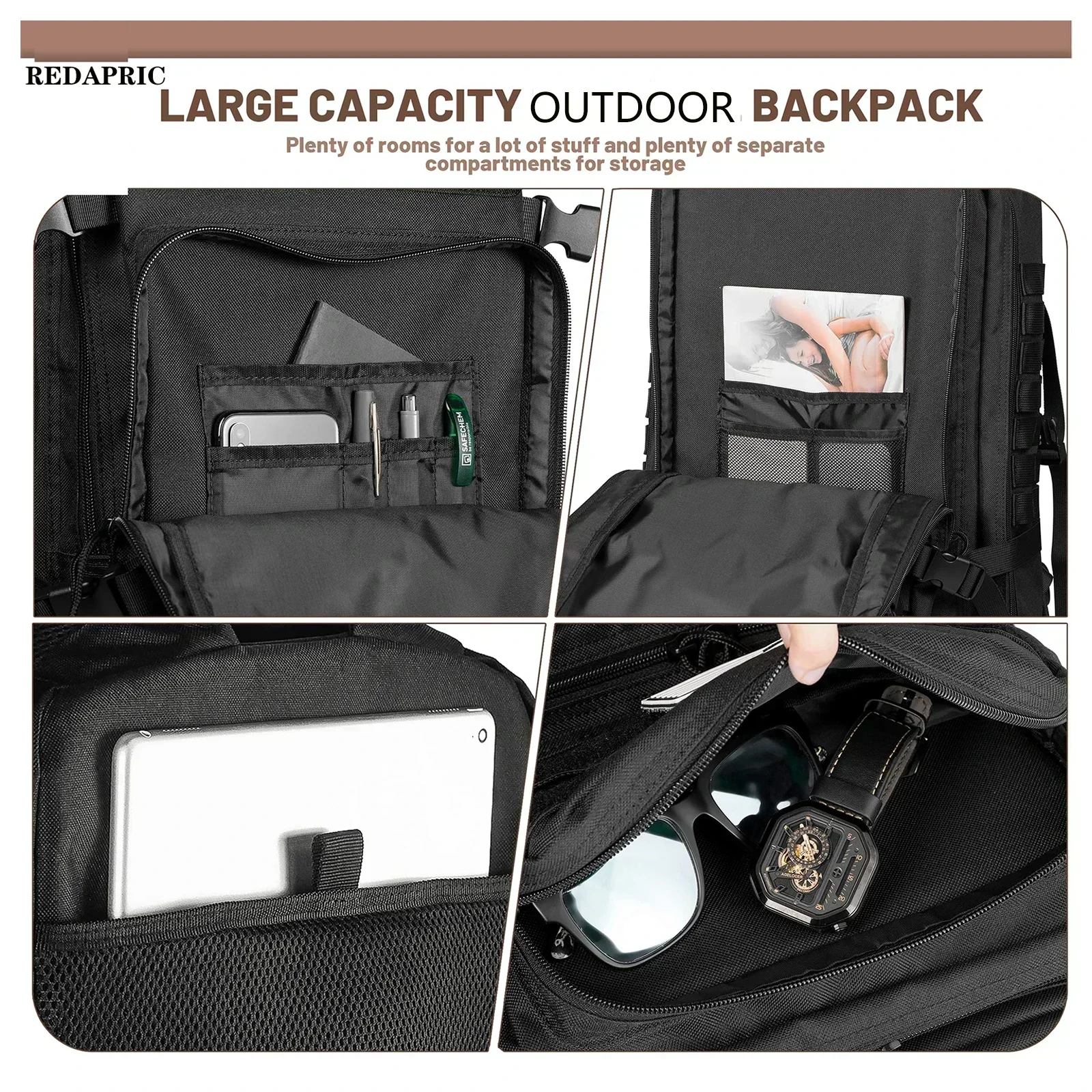 【Amazing Capacity】The upgraded tactical shoulder backpack is strengthened to 40L. Size approx: 13*11.8*20Inches(L*W*H). The unique hydration insulation layer on the back can keep liquid cool for up to 6 hours.The side pockets are added for fishing gear, camping kits, survival kits, and so on.