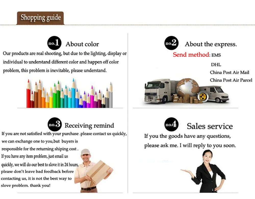 Feedback: 1. Please leave 5 star feedback if you're satisfied with our products and service, we will appreciate it (Item as Described 5 stars, Communication 5 stars, Shipping time 5-stars). 2. If the products you received was damaged or wrong styles, please don't leave any negative feedbacks first, kindly please contact us,we will deal with it and work out the best solutions, Your satisfication is our motion to do better. Shipping and return policy: 1. After you pay, we usually send you the package within 48 hours 2. China post ordinary small packet plus and China post registered air mail takes estimated 15-60 days. 3. Recommended shipments: Aliexpress standard shipping--more stable,safer,faster. 4. We also offer express shippings like DHL, UPS, EMS etc, please feel free to contact us if you are urgently in need of it or the quantity is large.